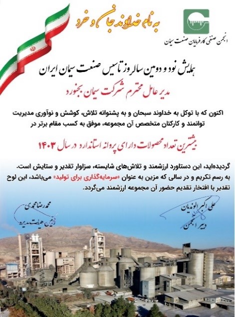 در آیین بزرگداشت نود و دومین سالروز صنعت سیمان کشور، از شرکتهای برتر، پژوهشگران و نویسندگان حوزه صنعت سیمان و پیشکسوتان شاخص این صنعت که بر اساس ارزیابیهای تخصصی و معیارهای عملکردی انتخاب شده بودند، با اهدای لوح تقدیر تجلیل بهعمل آمد.